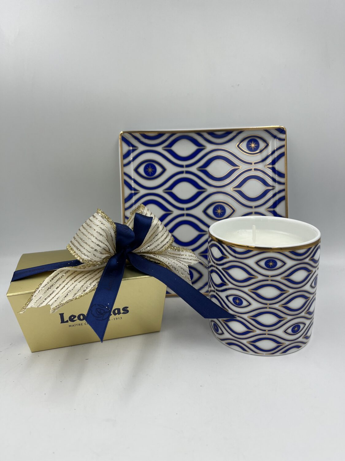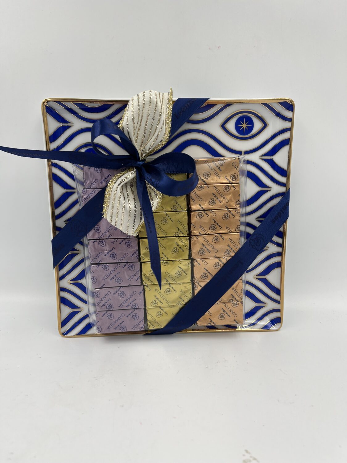 Δίσκος πορσελάνης (~17Χ17) Fine porcelain σε σχέδιο κύμα/μάτι σε χρώματα μπλε και χρυσό. Ο δίσκος περιλαμβάνει μια κλασική συσκευασία με 13-15τμχ πραλίνες ποικιλία LEONIDAS και ένα κερί σε δοχείο Fine porcelain στο ίδιο σχέδιο του δίσκου.