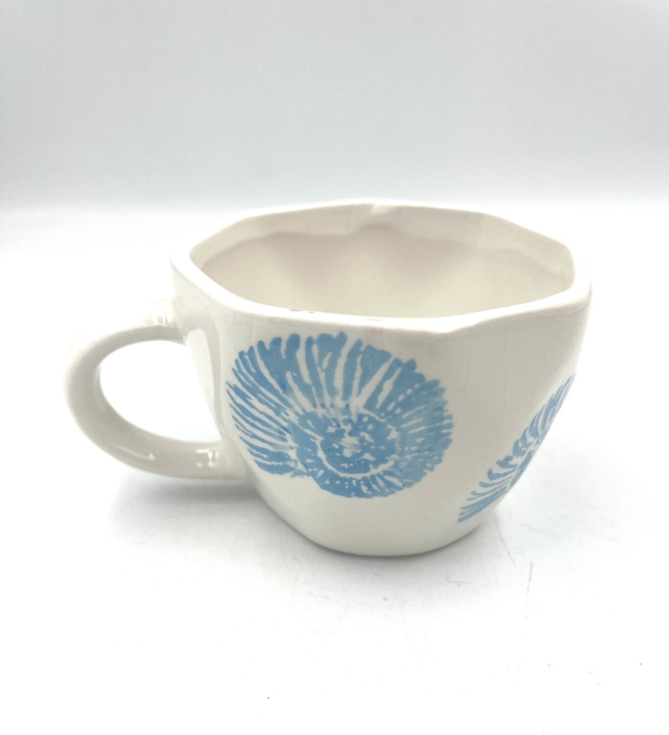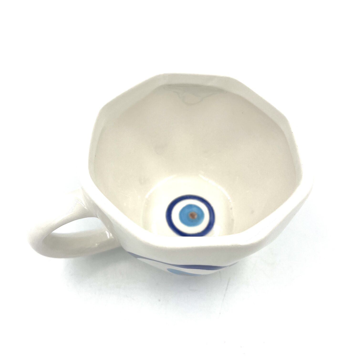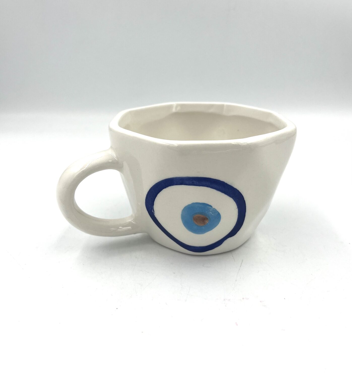 Κούπα ασύμμετρη κεραμική (Υ 5,5εκ. διαμ 9)με σχέδιο μάτι το οποίο υπάρχει και στο εσωτερικό της .